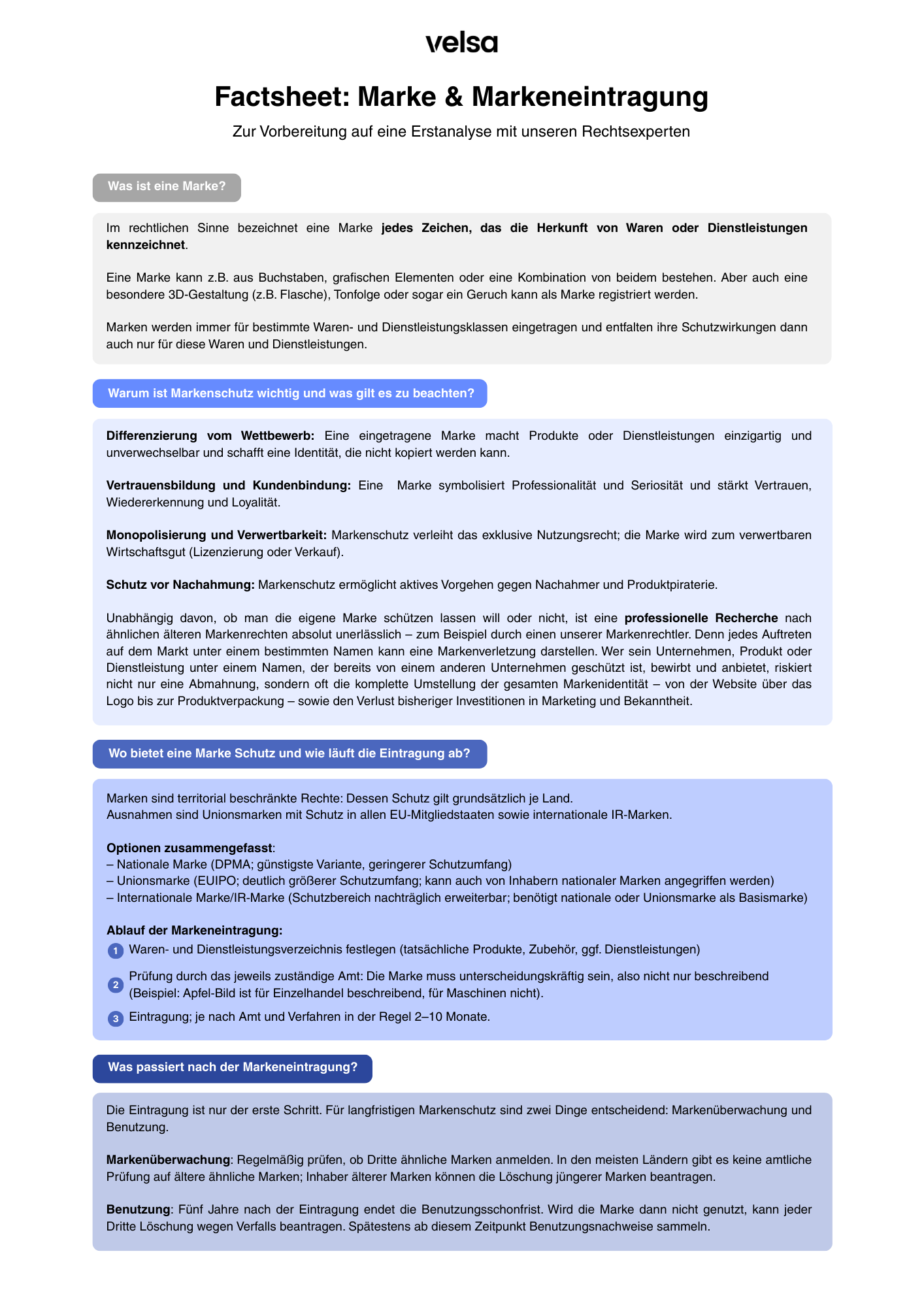 <div class='_14px w-richtext'><ol style='padding-left: 25px; margin-left: 0px;'><li style='padding-left: 10px;'><strong>Erstanalyse buchen:</strong> Buche eine umfassende <a href="#rechtsexperten" target="_blank">Erstanalyse</a> mit Deinem Rechtsexperten. In dieser Analyse werden Deine grundlegenden Fragen zur Markenanmeldung besprochen.</li><li style='padding-left: 10px;'><strong>Recherche:</strong> Hier prüft der <a href="#rechtsexperten" target="_blank">Rechtsexperte</a>, ob identische oder ähnliche Marken Konflikte verursachen können, und bespricht anschließend mit dir, wie dein Branding ggf. angepasst werden kann, um Risiken zu vermeiden.</li><li style='padding-left: 10px;'><strong>Anmeldung der Marke:</strong> Gemeinsam mit dem Rechtsexperten legst du fest, für welche Klassen und in welchen Ländern die Marke angemeldet werden soll. Anschließend bereitet der Rechtsexperte die Dokumente vor und reicht sie beim zuständigen Amt (z.B. DPMA oder EUIPO) ein.</li><li style='padding-left: 10px;'><strong>Prüfungsverfahren:</strong> Nach der Anmeldung erfolgt die Prüfung der Marke durch das zuständige Amt. Falls es dabei Rückfragen geben sollte, wird dein Rechtsexperte informiert und kümmert sich gemeinsam mit dir um Klärung.</li><li style='padding-left: 10px;'><strong>Eintragung der Marke:</strong> Nach der Anmeldung erfolgt die Prüfung der Marke durch das zuständige Amt. Wenn alle Anforderungen erfüllt sind, wird die Marke eingetragen und entfaltet ihren rechtlichen Schutz. Der rechtliche Schutz gilt für 10 Jahre.</li></ol></div>
